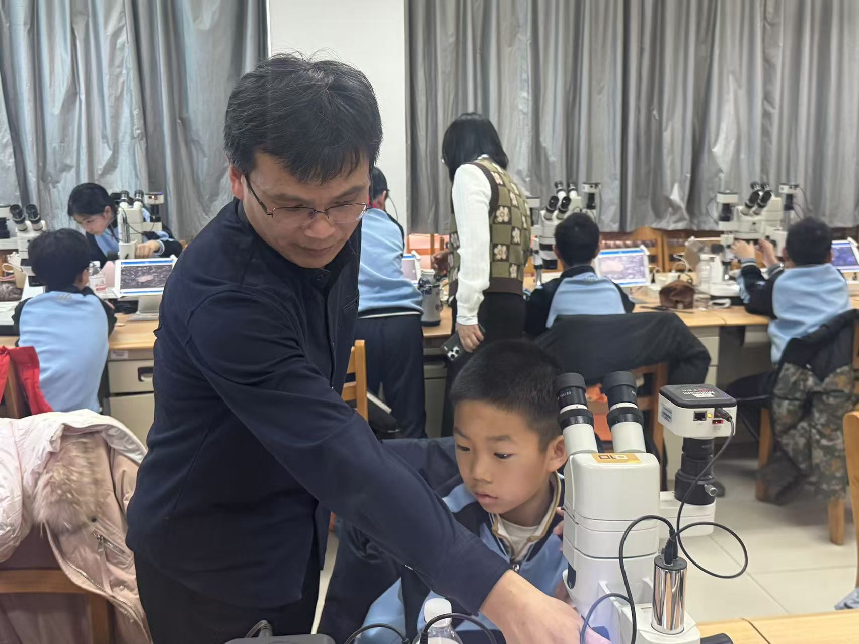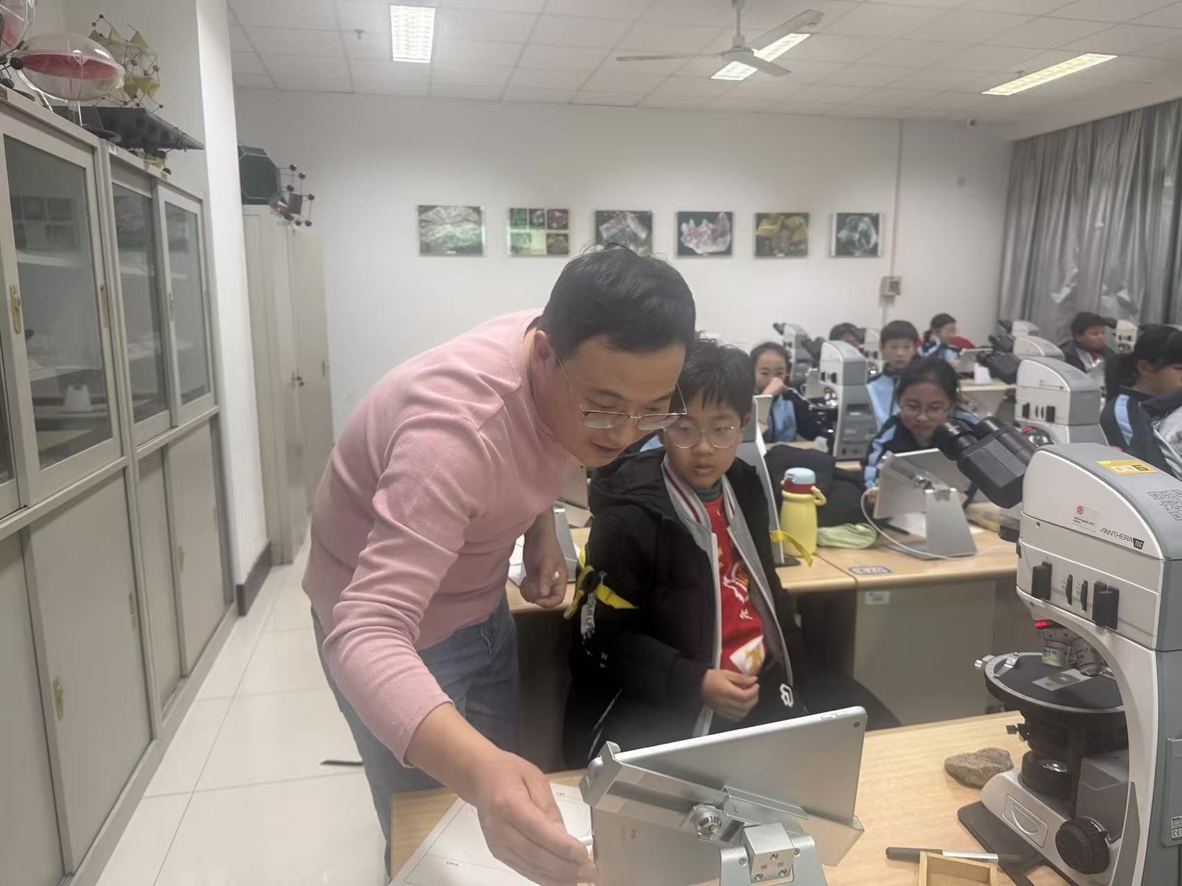 颜世永老师指导学生使用显微镜观察微体古生物化石