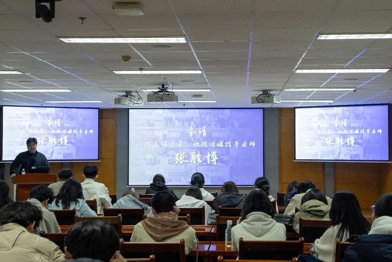 张胜博作会后总结。他首先对刘旭文的精彩分享表示衷心感谢,并针对新媒体时代如何做新闻,向与会成员提出三点希望:一是保持认真钻研的学习态度,无论技术如何更迭,新闻创作的底层逻辑始终不变,要练就扎实的基本功,认真打磨新闻作品,让学习成为一种习惯;二是锤炼明辨是非的判断力,新媒体环境下信息纷杂,要守住理性与底线,学会筛选和质疑,对网络热梗合理利用,做有立场、有原则的校园新闻人;三是涵养温暖向善的人文情怀,技术可以辅助创作,但真正的共鸣源于人心,要用真诚去倾听,用善意去表达,讲好地院故事,让校园新闻满怀温度与深度。